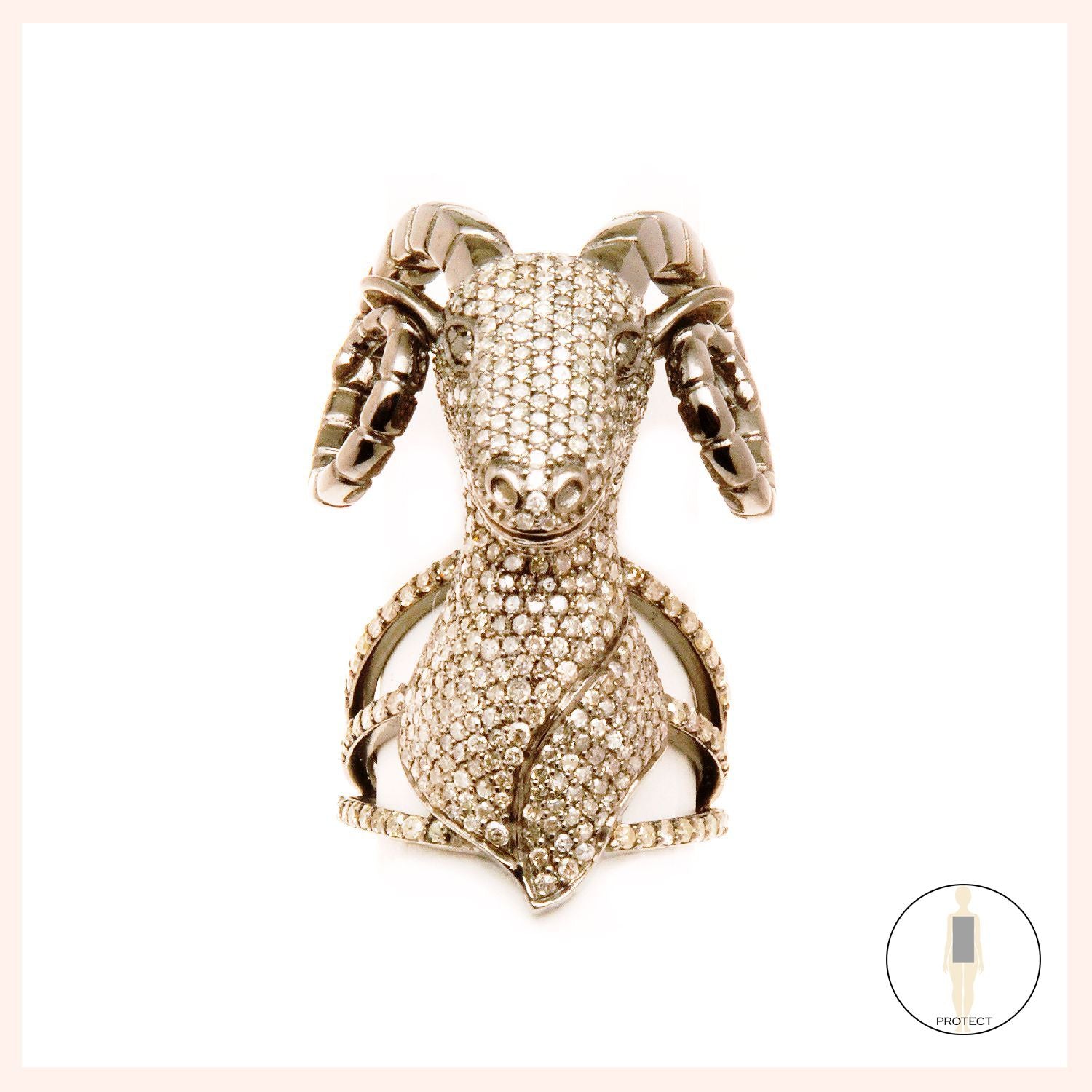 Carole Shashona’s handcrafted Ram Ring set in black diamonds on the motif of a ram is symbolic of determination, action, initiative, and leadership- bringing blessings to the wearer.